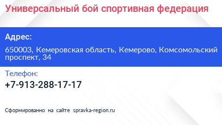Универсальный бой, спортивная федерация по адресу 650003, Кемеровская область, Кемерово, Комсомольский проспект, 34 в дальнейшем Организация, размещена в следующих категориях: