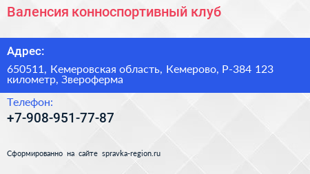 Валенсия, конноспортивный клуб по адресу 650511, Кемеровская область, Кемерово, Р-384 123 километр, Звероферма в дальнейшем Организация, размещена в следующих категориях: