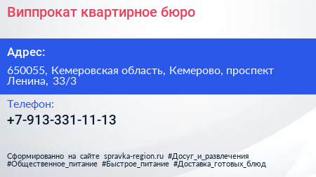 Виппрокат, квартирное бюро по адресу 650055, Кемеровская область, Кемерово, проспект Ленина, 33/3 в дальнейшем Организация, размещена в следующих категориях: