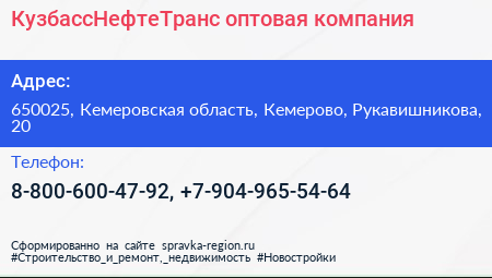 КузбассНефтеТранс, оптовая компания по адресу 650025, Кемеровская область, Кемерово, Рукавишникова, 20 в дальнейшем Организация, размещена в следующих категориях: