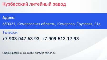 Кузбасский литейный завод по адресу 650021, Кемеровская область, Кемерово, Грузовая, 21а в дальнейшем Организация, размещена в следующих категориях: