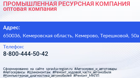 ПРОМЫШЛЕННАЯ РЕСУРСНАЯ КОМПАНИЯ, оптовая компания по адресу 650036, Кемеровская область, Кемерово, Терешковой, 50а в дальнейшем Организация, размещена в следующих категориях:
