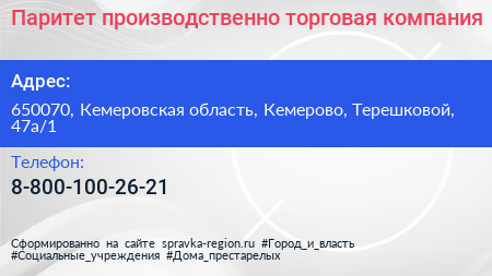 Паритет, производственно-торговая компания по адресу 650070, Кемеровская область, Кемерово, Терешковой, 47а/1 в дальнейшем Организация, размещена в следующих категориях: