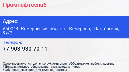 Промнефтеснаб по адресу 650044, Кемеровская область, Кемерово, Шахтёрская, 9а/3 в дальнейшем Организация, размещена в следующих категориях: