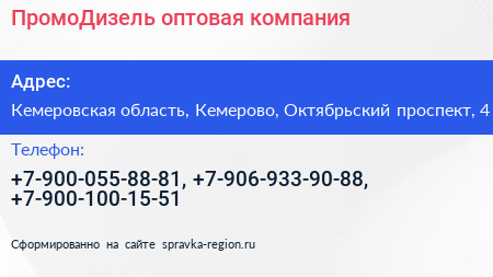 ПромоДизель, оптовая компания по адресу Кемеровская область, Кемерово, Октябрьский проспект, 4 в дальнейшем Организация, размещена в следующих категориях: