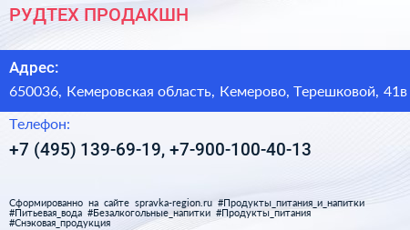 РУДТЕХ ПРОДАКШН по адресу 650036, Кемеровская область, Кемерово, Терешковой, 41в в дальнейшем Организация, размещена в следующих категориях: