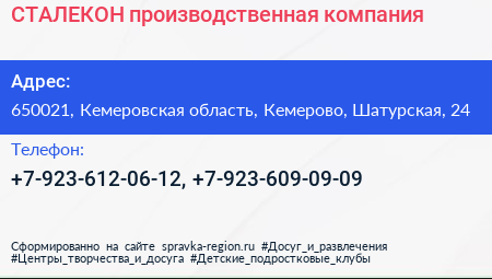 СТАЛЕКОН, производственная компания по адресу 650021, Кемеровская область, Кемерово, Шатурская, 24 в дальнейшем Организация, размещена в следующих категориях: