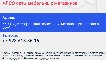 АЛСО, сеть мебельных магазинов по адресу 650070, Кемеровская область, Кемерово, Тухачевского, 50/4 в дальнейшем Организация, размещена в следующих категориях: