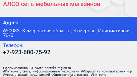 АЛСО, сеть мебельных магазинов по адресу 650033, Кемеровская область, Кемерово, Инициативная, 76/3 в дальнейшем Организация, размещена в следующих категориях: