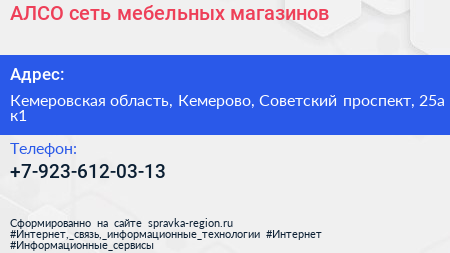 АЛСО, сеть мебельных магазинов по адресу Кемеровская область, Кемерово, Советский проспект, 25а к1 в дальнейшем Организация, размещена в следующих категориях: