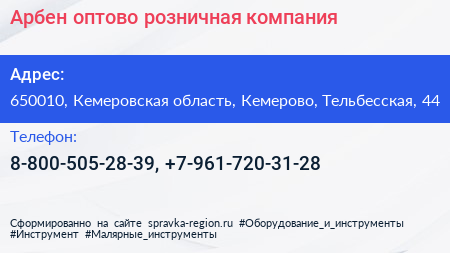 Арбен, оптово-розничная компания по адресу 650010, Кемеровская область, Кемерово, Тельбесская, 44 в дальнейшем Организация, размещена в следующих категориях: