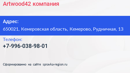 Artwood42, компания по адресу 650021, Кемеровская область, Кемерово, Рудничная, 13 в дальнейшем Организация, размещена в следующих категориях: