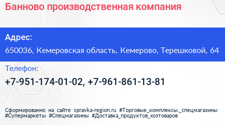 Банново, производственная компания по адресу 650036, Кемеровская область, Кемерово, Терешковой, 64 в дальнейшем Организация, размещена в следующих категориях:
