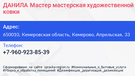 ДАНИЛА-Мастер, мастерская художественной ковки по адресу 650010, Кемеровская область, Кемерово, Апрельская, 33 в дальнейшем Организация, размещена в следующих категориях: