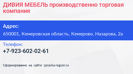ДИВИЯ МЕБЕЛЬ, производственно-торговая компания по адресу 650001, Кемеровская область, Кемерово, Назарова, 2а в дальнейшем Организация, размещена в следующих категориях: