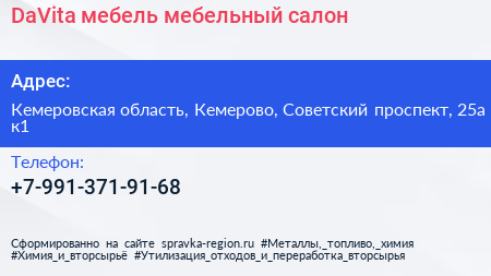 DaVita-мебель, мебельный салон по адресу Кемеровская область, Кемерово, Советский проспект, 25а к1 в дальнейшем Организация, размещена в следующих категориях: