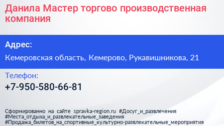 Данила Мастер, торгово-производственная компания по адресу Кемеровская область, Кемерово, Рукавишникова, 21 в дальнейшем Организация, размещена в следующих категориях: