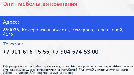 Элит, мебельная компания по адресу 650036, Кемеровская область, Кемерово, Терешковой, 41/6 в дальнейшем Организация, размещена в следующих категориях: