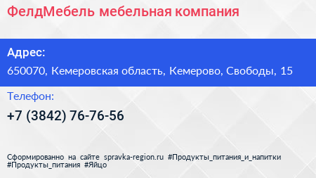 ФелдМебель, мебельная компания по адресу 650070, Кемеровская область, Кемерово, Свободы, 15 в дальнейшем Организация, размещена в следующих категориях: