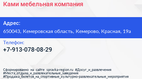 Ками, мебельная компания по адресу 650043, Кемеровская область, Кемерово, Красная, 19а в дальнейшем Организация, размещена в следующих категориях: