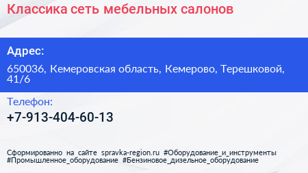 Классика, сеть мебельных салонов по адресу 650036, Кемеровская область, Кемерово, Терешковой, 41/6 в дальнейшем Организация, размещена в следующих категориях:
