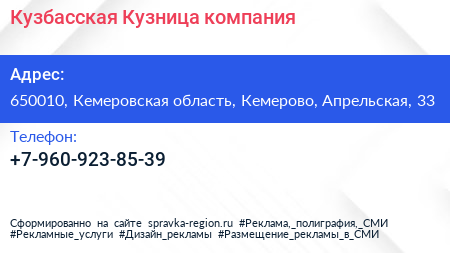 Кузбасская Кузница, компания по адресу 650010, Кемеровская область, Кемерово, Апрельская, 33 в дальнейшем Организация, размещена в следующих категориях: