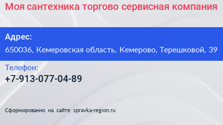 Моя сантехника, торгово-сервисная компания по адресу 650036, Кемеровская область, Кемерово, Терешковой, 39 в дальнейшем Организация, размещена в следующих категориях: