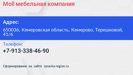 Moll, мебельная компания по адресу 650036, Кемеровская область, Кемерово, Терешковой, 41/6 в дальнейшем Организация, размещена в следующих категориях: