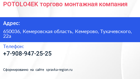 POTOLO4EK, торгово-монтажная компания по адресу 650036, Кемеровская область, Кемерово, Тухачевского, 22а в дальнейшем Организация, размещена в следующих категориях: