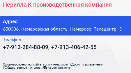 Перилла-К, производственная компания по адресу 650036, Кемеровская область, Кемерово, Телецентр, 3 в дальнейшем Организация, размещена в следующих категориях: