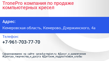 TronePro, компания по продаже компьютерных кресел по адресу Кемеровская область, Кемерово, Дзержинского, 4а в дальнейшем Организация, размещена в следующих категориях: