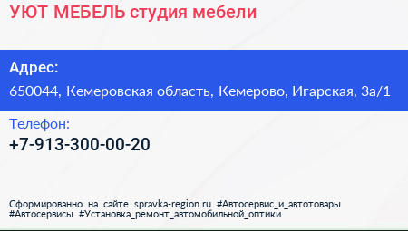 УЮТ МЕБЕЛЬ, студия мебели по адресу 650044, Кемеровская область, Кемерово, Игарская, 3а/1 в дальнейшем Организация, размещена в следующих категориях: