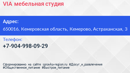 VIA, мебельная студия по адресу 650016, Кемеровская область, Кемерово, Астраханская, 3 в дальнейшем Организация, размещена в следующих категориях: