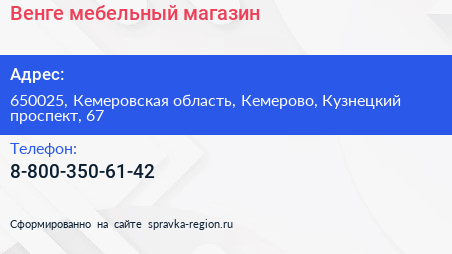 Венге, мебельный магазин по адресу 650025, Кемеровская область, Кемерово, Кузнецкий проспект, 67 в дальнейшем Организация, размещена в следующих категориях: