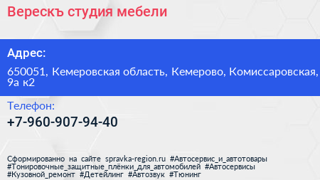 Верескъ, студия мебели по адресу 650051, Кемеровская область, Кемерово, Комиссаровская, 9а к2 в дальнейшем Организация, размещена в следующих категориях: