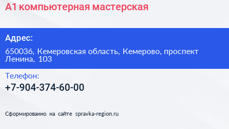 А1, компьютерная мастерская по адресу 650036, Кемеровская область, Кемерово, проспект Ленина, 103 в дальнейшем Организация, размещена в следующих категориях: