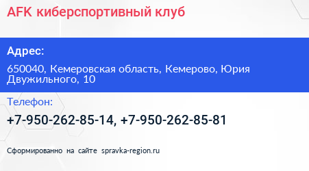 AFK, киберспортивный клуб по адресу 650040, Кемеровская область, Кемерово, Юрия Двужильного, 10 в дальнейшем Организация, размещена в следующих категориях: