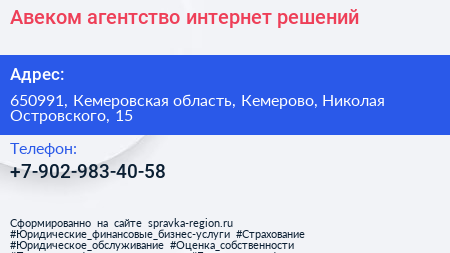 Авеком, агентство интернет-решений по адресу 650991, Кемеровская область, Кемерово, Николая Островского, 15 в дальнейшем Организация, размещена в следующих категориях: