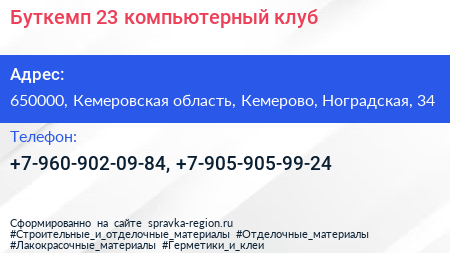 Буткемп 23, компьютерный клуб по адресу 650000, Кемеровская область, Кемерово, Ноградская, 34 в дальнейшем Организация, размещена в следующих категориях: