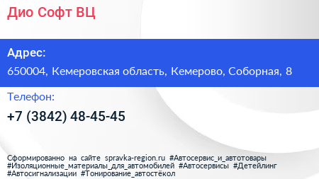 Дио-Софт ВЦ по адресу 650004, Кемеровская область, Кемерово, Соборная, 8 в дальнейшем Организация, размещена в следующих категориях: