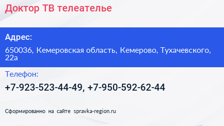 Доктор ТВ, телеателье по адресу 650036, Кемеровская область, Кемерово, Тухачевского, 22а в дальнейшем Организация, размещена в следующих категориях: