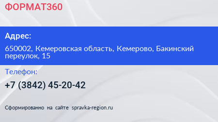 ФОРМАТ360 по адресу 650002, Кемеровская область, Кемерово, Бакинский переулок, 15 в дальнейшем Организация, размещена в следующих категориях: