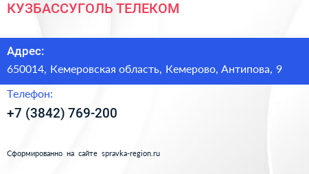 КУЗБАССУГОЛЬ-ТЕЛЕКОМ по адресу 650014, Кемеровская область, Кемерово, Антипова, 9 в дальнейшем Организация, размещена в следующих категориях: