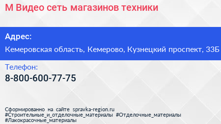 М.Видео, сеть магазинов техники по адресу Кемеровская область, Кемерово, Кузнецкий проспект, 33Б в дальнейшем Организация, размещена в следующих категориях: