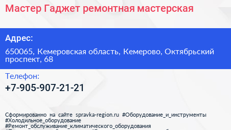 Мастер-Гаджет, ремонтная мастерская по адресу 650065, Кемеровская область, Кемерово, Октябрьский проспект, 68 в дальнейшем Организация, размещена в следующих категориях: