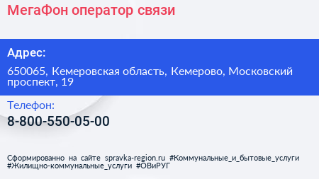 МегаФон, оператор связи по адресу 650065, Кемеровская область, Кемерово, Московский проспект, 19 в дальнейшем Организация, размещена в следующих категориях: