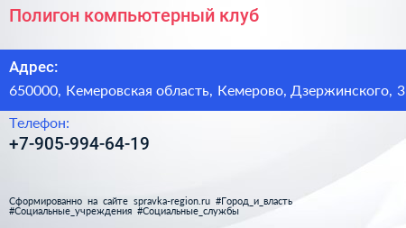 Полигон, компьютерный клуб по адресу 650000, Кемеровская область, Кемерово, Дзержинского, 3 в дальнейшем Организация, размещена в следующих категориях:
