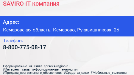 SAVIRO, IT-компания по адресу Кемеровская область, Кемерово, Рукавишникова, 26 в дальнейшем Организация, размещена в следующих категориях: