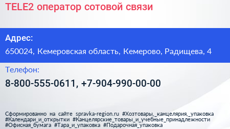 TELE2, оператор сотовой связи по адресу 650024, Кемеровская область, Кемерово, Радищева, 4 в дальнейшем Организация, размещена в следующих категориях: