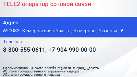 TELE2, оператор сотовой связи по адресу 650033, Кемеровская область, Кемерово, Леонова, 9 в дальнейшем Организация, размещена в следующих категориях: